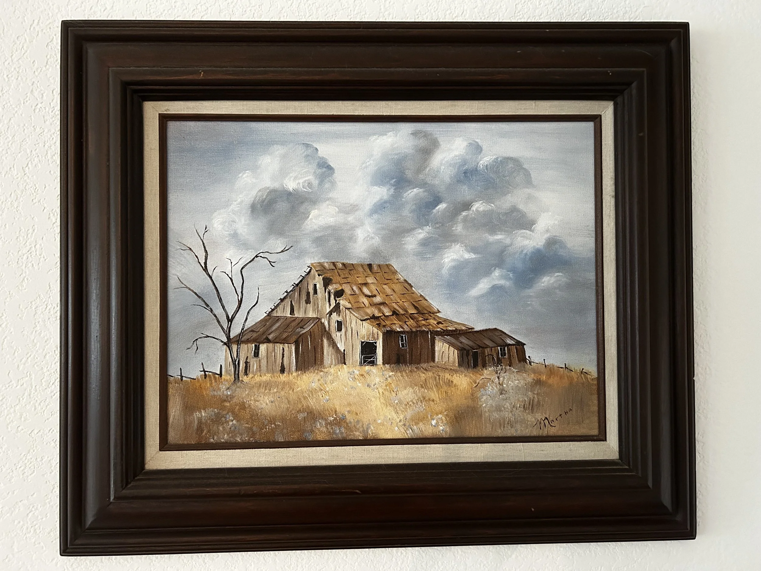 Ultimately, I’ve been glad of the the items that moved from their house to ours, like my Nan’s original painting of an old barn framed by storm clouds. Like the mug that sat in my Paw Paw’s office for years and now holds my coffee. And the brown leather book that sits in our room.