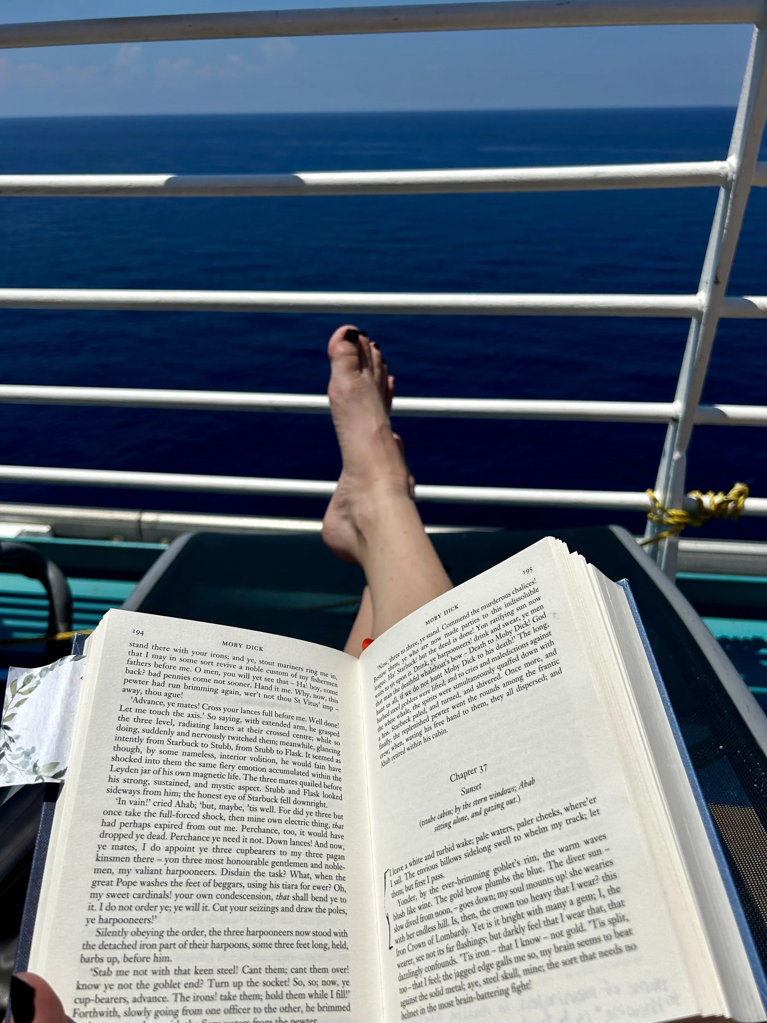 Usually when I travel, I pack “comfort books,” knowing that I likely won’t have time to read. They’re to have on hand just in case. (What’s worse than realizing you’ve stumbled upon the perfect time and place to read a book, but you don’t have one?!) This trip, thankfully, provided ample reading time. And so on the top deck surrounded by the rhythm of the ocean and steel drums, I pondered Moby Dick’s Chapter 37, “Sunset.”